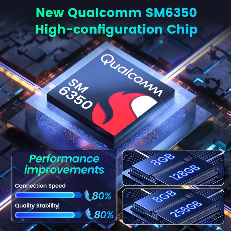 • Qualcomm SM6350 CPU, 8GB RAM + 256GB ROM, Dual WiFi bands (2.4G/5G), Bluetooth 5.1